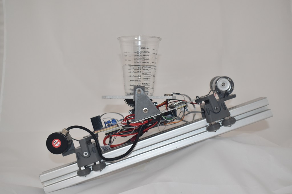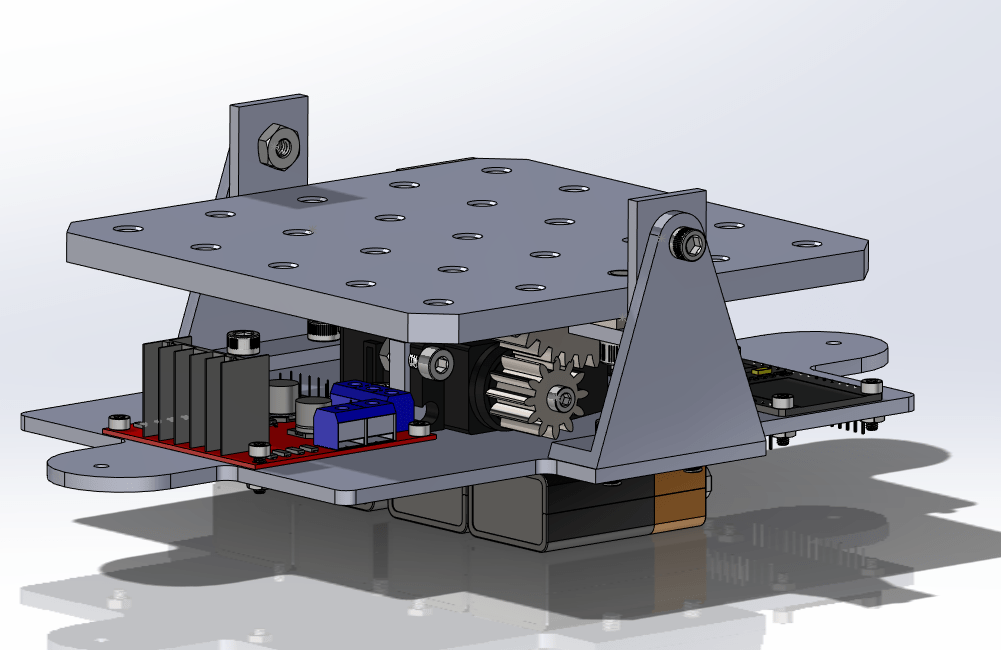 The tilting platform seen above is monitored by the IMU attached to the bottom and tilted back to level using gears. The IMU measures the angle/movement and sends data to the microcontroller which signals a servomotor to tilt the platform. The holes on the platform are for screwing one’s end-effector of choice onto it.