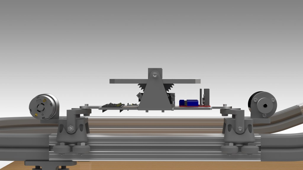 Both wheelbases rendered above have two degrees of freedom and consist of 5 wheels, a plastic wheelbase, one DC motor, and a connecting rod to attach it to the chassis which houses the electronics. The wheel on the top of the 80-20 is driven directly by the DC motor using a ribbed band (not pictured) where the side wheels rotate freely and keep the device upright.