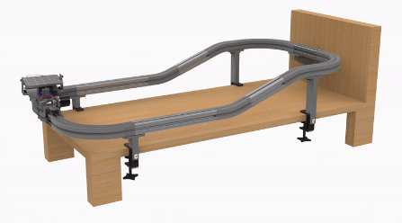 The track and mounting system uses normal laboratory clamps and 3D-printable mounts which allow it to connect to vertical and horizontal surfaces as seen in the photo above. 3D-printed track pieces allow it to turn left, right, up, and down while still primarily using standard 80-20 rail.